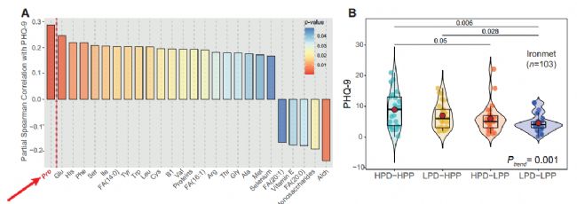 首先對縱向發(fā)現(xiàn)隊列(IRONMET,n=116)的血漿和糞便樣本進(jìn)行代謝組學(xué)分析,基于機器學(xué)習(xí)變量選擇策略篩選出幾種與PHQ-9評分相關(guān)的代謝物。通過另一個獨立驗證隊列(IMAGEOMICS,n=919)血漿樣本進(jìn)行驗證。其中兩個隊列最一致的發(fā)現(xiàn)是,血漿脯氨酸與抑郁評分的強正相關(guān)(通過代謝物與臨床指標(biāo)最強相關(guān)性的代謝物進(jìn)行聚焦)。且通過食物頻率問卷對常規(guī)營養(yǎng)素、維生素、礦物質(zhì)、氨基酸和脂肪酸與發(fā)現(xiàn)隊列(IRONMET)PHQ-9評分進(jìn)行分析。結(jié)果顯示,脯氨酸是對抑郁癥影響最大的因素。于是聚焦脯氨酸并開展后續(xù)驗證。全面揭示,依賴于腸道菌群的脯氨酸代謝變化對抑郁癥的影響,并提示靶向菌群/膳食脯氨酸或可有效改善抑郁。