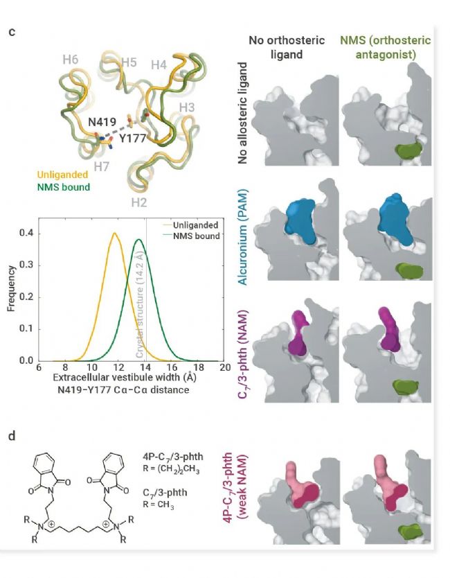 Ron O. Dror等人利用分子動(dòng)力學(xué)模擬揭示了 M2 毒蕈堿乙酰膽堿受體 (M2 受體) 的幾種變構(gòu)調(diào)節(jié)劑的結(jié)合位點(diǎn)、結(jié)合構(gòu)象和特異性藥物-受體相互作用。圖 4 還顯示了經(jīng)典配體結(jié)合的正、負(fù)變構(gòu)調(diào)節(jié)機(jī)制,包括兩個(gè)結(jié)合位點(diǎn)的耦合構(gòu)象變化和這些位點(diǎn)上配體之間的靜電相互作用。這項(xiàng)研究不僅增進(jìn)了對(duì) GPCR 變構(gòu)調(diào)節(jié)機(jī)制的理解,也為開(kāi)發(fā)新型藥物提供了重要信息。