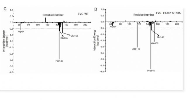 Weiwei Xue 等人基于同源建模構(gòu)建的 HIV-1 整合酶四聚體結(jié)構(gòu),使用分子動(dòng)力學(xué) (MD) 模擬和 RIN 分析來(lái)研究交叉耐藥突變對(duì) INSTIs 的影響。MD 模擬顯示,INSTIs 與 HIV-1 整合酶活性位點(diǎn)的結(jié)合模式受到 E138K/Q148K 突變的影響,導(dǎo)致活性位點(diǎn)的結(jié)構(gòu)重排 (圖 5A、B)。通過(guò)結(jié)合自由能計(jì)算,發(fā)現(xiàn) Pro145 殘基在 INSTIs 與 HIV-1 整合酶結(jié)合中起到重要作用,特別是其與 INSTIs 的疏水相互作用 (圖 5C、D)。該研究不僅為理解 HIV-1 整合酶抑制劑的交叉耐藥機(jī)制提供了重要信息,而且為未來(lái)合理設(shè)計(jì)新的 INSTIs 以克服交叉耐藥性提供了理論基礎(chǔ)。