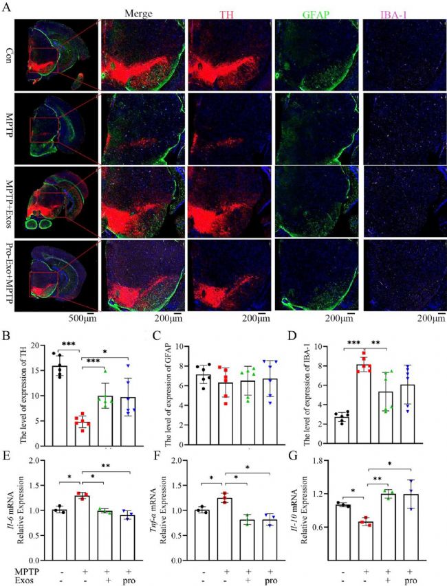 UCB-Exos 顯著改善了 MPTP 誘導的中腦 IL-6、TNF-α 和 IL-10 水平異常。因此,UCB-Exos 可以抑制神經(jīng)毒素誘導的多巴胺能神經(jīng)元丟損傷并減輕神經(jīng)炎癥。預防性 UCB-Exos 干預也具有神經(jīng)保護作用。