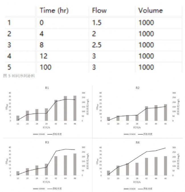 本研究在實驗室成熟的發(fā)酵培養(yǎng)基配方基礎(chǔ)上進行,嚴(yán)格控制各項參數(shù)(如表2所示)。為了優(yōu)化質(zhì)粒產(chǎn)量,我們嘗試了三種不同的補料策略:補料關(guān)聯(lián)DO_PV、恒速補料和時間序列補料。