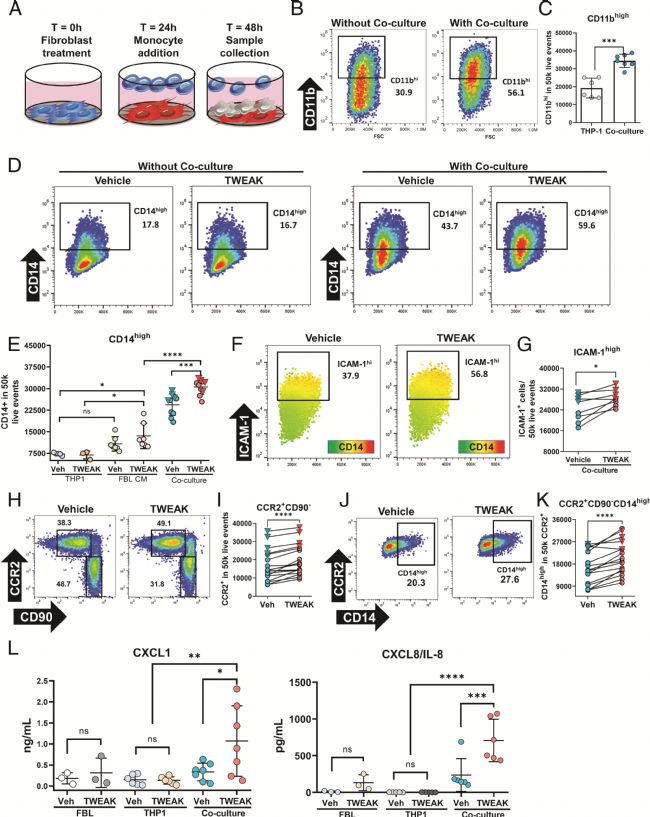 鑒于 TWEAK 介導(dǎo)的 ICAM-1 和 VCAM-1 上調(diào),以及 CCL2 的高分泌,實(shí)驗(yàn)假設(shè) TWEAK 誘導(dǎo)的炎性成纖維細(xì)胞促進(jìn)單核細(xì)胞募集或激活。
