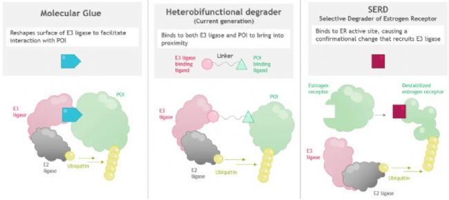 如圖1所示,目前的TPD領域主要涵蓋三種類型的分子:分子膠、異雙功能降解劑(heterobifunctional degraders)和選擇性雌激素受體降解劑(SERD)。