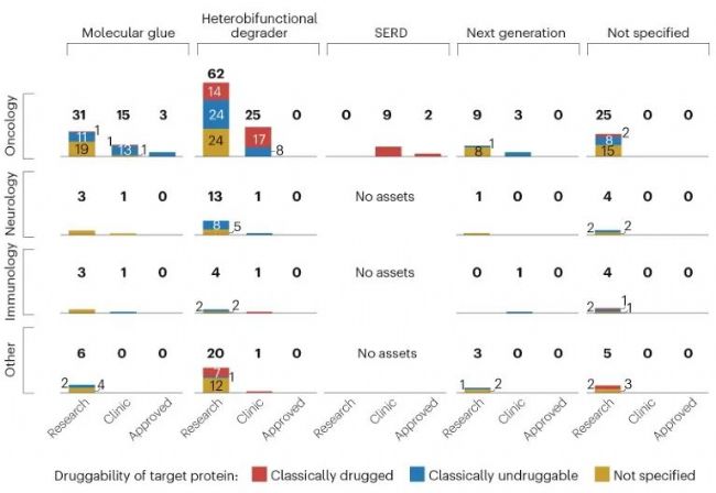 治療領域拓展到非腫瘤領域雖然所有獲批上市的藥物和絕大多數(shù)(90%)臨床藥物都集中在腫瘤學領域,但降解劑的應用正在向其他治療領域拓展,如神經(jīng)病學和免疫學。目前的臨床前項目中,神經(jīng)病學項目占11%,免疫學項目占6%。此外,針對非腫瘤疾病的治療,如異雙功能降解劑(ARV-102、KT-474)和分子膠(BMS-986419、MRT-6160)等,也已經(jīng)進入臨床試驗階段。
