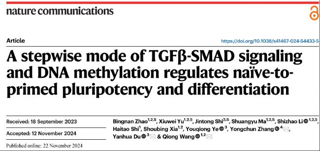 近日,上海交通大學(xué)基礎(chǔ)醫(yī)學(xué)院王瓊研究員、Yanhua Du和生命科學(xué)技術(shù)學(xué)院章永春團隊合作,共同探討了TGFβ-Smad信號通路和DNA甲基化在調(diào)控小鼠胚胎干細(xì)胞(mESCs)從原始態(tài)多能性(naïve pluripotency)向始發(fā)態(tài)多能性(primed pluripotency)轉(zhuǎn)變以及隨后的分化過程中的作用。相關(guān)研究成果以“A stepwise mode of TGFβ-SMAD signaling and DNA methylation regulates naïve-to-primed pluripotency and differentiation”為題發(fā)表在Nature子刊《Nature Communications》上。