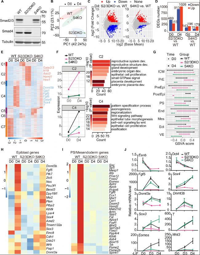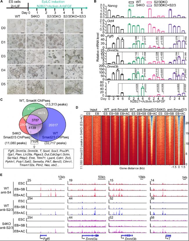 B. mESC-EpiLC-ME兩步誘導(dǎo)方案(頂部)。將細(xì)胞轉(zhuǎn)移到含有Activin A和bFGF的N2B27培養(yǎng)基中培養(yǎng)6天后,EpiLCs進一步在加入CHIR99021的N2B27培養(yǎng)基中培養(yǎng)24小時以形成ME。western blot顯示W(wǎng)T、S4KO和S2/3DKO中Dnmt3a、Dnmt3b、Eomes、Smad4和Smad2/3的表達。