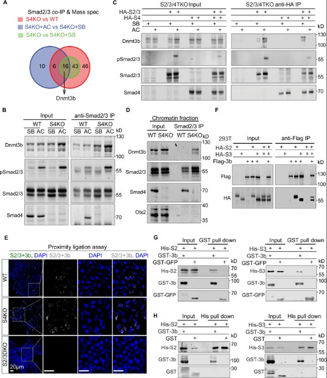 A. Smad2/3共免疫沉淀和質(zhì)譜(IP-MS)分析維恩圖。在WT和S4KO的D3 EBs中進行Smad2/3 IP-MS,包括未處理的、用SB或AC處理的樣本。在所有三個比較中(S4KO與WT、S4KO+AC與S4KO+SB、S4KO與S4KO+SB)鑒定出16種蛋白質(zhì),包括Dnmt3b。