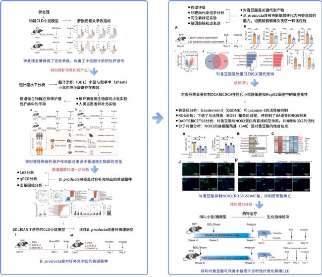 本研究發(fā)現(xiàn)B. producta產(chǎn)生的對香豆酸能夠抑制NADPH氧化酶2(NOX2)的活性,從而減少膽汁酸(BA)誘導(dǎo)的GSDME介導(dǎo)的肝細胞焦亡,最終保護宿主免受肝外梗阻性和肝內(nèi)膽汁淤積的損害。此外,還驗證了在大型動物中,口服鋅和對香豆酸對慢性肝病也具有潛在的治療作用,進一步增強了本研究的轉(zhuǎn)化意義。