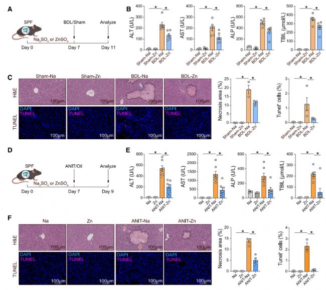 膽管結(jié)扎(BDL,梗阻性膽汁淤積)和α -萘基異硫氰酸酯(ANIT,肝內(nèi)膽汁淤積)誘導(dǎo)小鼠CLD,BDL和ANIT均引起肝損傷相關(guān)參數(shù)的顯著升高,包括血漿丙氨酸轉(zhuǎn)氨酶(ALT)、天冬氨酸轉(zhuǎn)氨酶(AST)、堿性磷酸酶(ALP)和總膽紅素(TBIL),口服鋅處理顯著降低了這些參數(shù),改善了小鼠膽汁淤積性肝損傷。