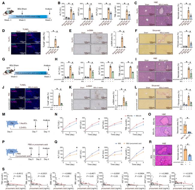 鋅和對香豆酸均能有效抑制小鼠膽汁淤積性慢性肝損傷和纖維化,在豬模型(大型動物模型)中,鋅預(yù)處理顯著降低了膽汁淤積性肝損傷標(biāo)志物,而對香豆酸也表現(xiàn)出對豬CLD的保護作用。此外,患者血漿中對香豆酸水平與多種肝功能指標(biāo)呈顯著負相關(guān),進一步表明這種微生物功能化合物參與CLD的發(fā)展。