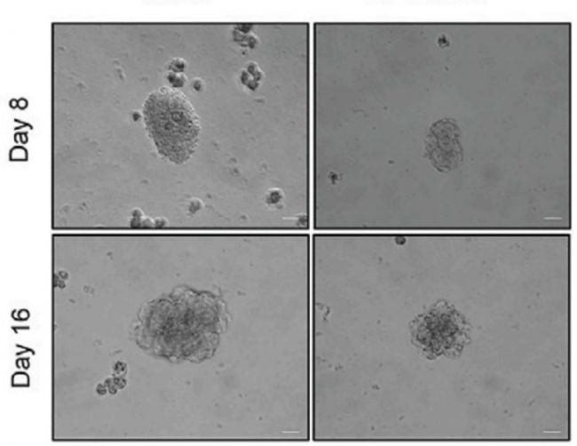 B:作為團(tuán)塊和單細(xì)胞在Matrigel涂層的海藻酸鹽微載體(MC)和聚集體上的細(xì)胞形態(tài)。細(xì)胞系UKBi005-A用于微載體方法,細(xì)胞系BIONi010-C用于聚集體方法。標(biāo)尺=500 μm。