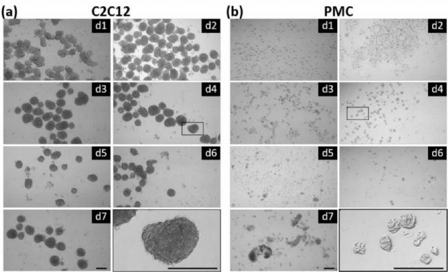 “懸浮培養(yǎng)中的肌球體形成。C2C12(a)和豬初級(jí)肌肉細(xì)胞(PMCs,(b))分別以200,000或100,000個(gè)細(xì)胞/mL的密度接種到CERO 3D培養(yǎng)箱和生物反應(yīng)器(OLS)中,并對(duì)7天內(nèi)的肌球體形成進(jìn)行分析。在所有時(shí)間點(diǎn)均觀察到大量圓形肌球體。底部圖像(右側(cè))顯示了第4天肌球體的放大圖。標(biāo)尺:200 μm。”