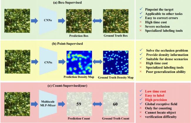 圖1 不同監(jiān)督方式的麥穗計(jì)數(shù)方法對(duì)比