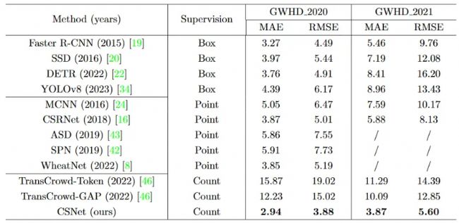 為了驗(yàn)證所提出的CSNet的有效性,我們將所提出的方法與目標(biāo)檢測(cè)算法、密度圖計(jì)數(shù)方法及于人群的計(jì)數(shù)監(jiān)督方法在GWHD2020和GWHD2021數(shù)據(jù)集上進(jìn)行了比較,如表1所示。