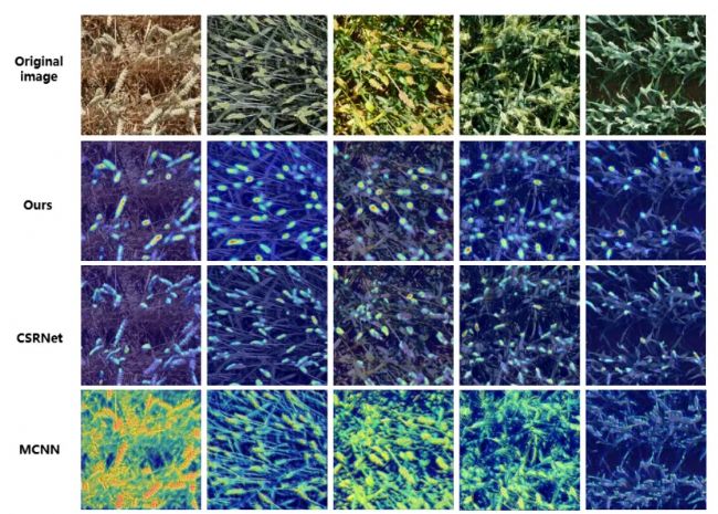 此外,我們對(duì)CSNet進(jìn)行了可視化實(shí)驗(yàn),以深入理解其在麥穗識(shí)別任務(wù)中表現(xiàn)。在具體的實(shí)驗(yàn)中,我們?cè)赩GG16的最后一個(gè)卷積層中探索感興趣的區(qū)域,并使用熱圖將它們映射到原始圖像上,實(shí)驗(yàn)結(jié)果如圖3所示。