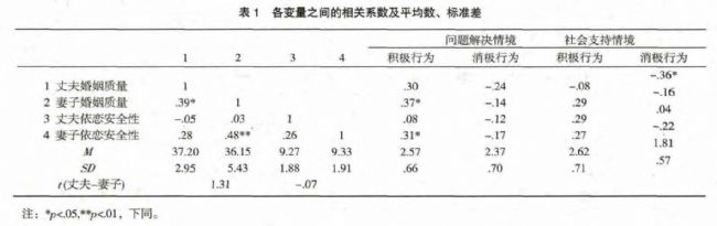 進行相關分析,結果如表1所示,妻子的婚姻質量只與夫妻問題解決互動中的積極行為相關,妻子的依戀安全性與其婚姻質量、夫妻問題解決積極行為均存在顯著正相關。丈夫婚姻質量只與夫妻社會支持互動中的消極行為相關;丈夫依戀安全性與其婚姻質量及夫妻溝通行為相關都不顯著。