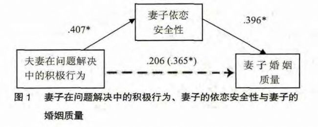 進行回歸分析,結果如圖1所示,在妻子的依戀安全性作為中介變量進入回歸方程之后,夫妻的積極行為對妻子婚姻質量的預測力都變的不顯著?梢缘贸,妻子的依戀安全性在其中起著完全中介作用。這一結果表明,夫妻在沖突情境中的積極行為完全通過影響妻子的依戀安全性進而影響其婚姻質量。這也驗證了研究假設,即沖突情境中的積極行為而不是消極行為更能影響人們的安全感。此外,結果表明妻子對雙方在解決沖突中的積極行為較敏感。在解決雙方的不一致時,丈夫如果能以幽默、傾聽等積極行為予以回應,則會讓妻子感受到安全感和可靠性,從而積極影響婚姻質量。比起解決她們個人生活中遇到的一個困難來說,妻子更看重兩人如何解決沖突,即女性更能在關系中獲得價值感。