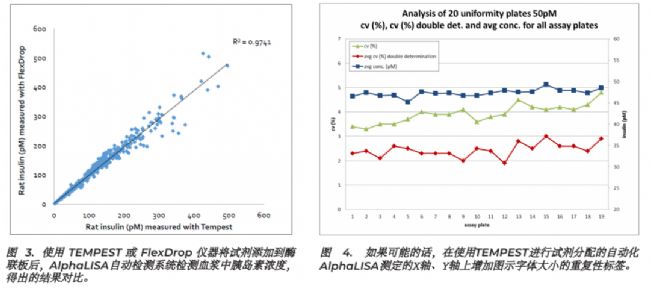 通過(guò)AlphaLISA自動(dòng)檢測(cè)系統(tǒng)處理736個(gè)樣品,連續(xù)兩天進(jìn)行兩次單獨(dú)的測(cè)定。第一天的使用兩臺(tái)FlexDrop裝置處理樣品,將抗體和珠子分配到酶聯(lián)板上。第2天使用TEMPEST來(lái)處理樣品和分配試劑,并對(duì)所得的濃度值進(jìn)行比較(圖3)。得到的R2值為0.9741,平均回收率為101%。