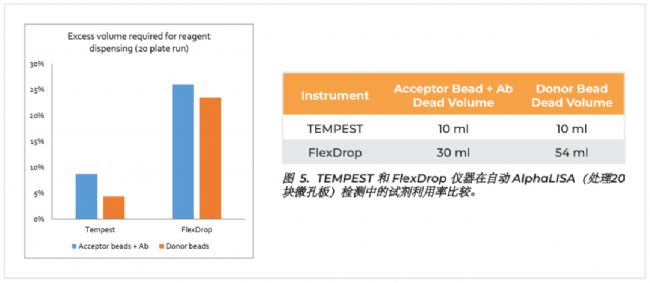 與基于電磁閥的分液儀器相比,TEMPEST® 微流體分液儀器將 AlphaLISA 試劑添加步驟自動(dòng)化,從而使試劑死體積從 30-65 毫升減少 6 倍至 5-10 毫升,同時(shí)在自動(dòng)化的工作流程中保持分析性能。