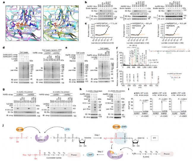 作者進(jìn)一步探究了AARS1/2調(diào)控蛋白質(zhì)賴氨酸乳酸化的具體機(jī)制:L-乳酸被AARS以ATP依賴的方式激活,生成中間體乳酸-AMP,然后將乳酸基團(tuán)Lac轉(zhuǎn)移至目標(biāo)蛋白質(zhì)N端特定的賴氨酸殘基上。AARS1/2與L-乳酸結(jié)合,直接催化L-乳酸在賴氨酸受體端進(jìn)行ATP依賴性的乳酸化。該模式能夠?qū)⑵咸烟堑拇x產(chǎn)物L(fēng)-乳酸和ATP共價修飾到蛋白質(zhì)上,直接改變重要蛋白質(zhì)的功能。在L-乳酸的作用下,AARS2與cGAS結(jié)合,在細(xì)胞和小鼠模型中介導(dǎo)cGAS的乳酸化,導(dǎo)致cGAS失活。