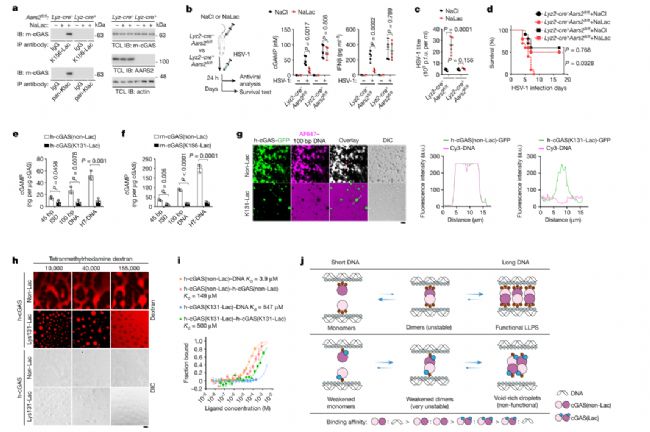 為進(jìn)一步明確為什么cGAS乳酸化后會轉(zhuǎn)而排斥DNA,作者分別比較了cGAS與DNA及自身蛋白的親和力。結(jié)果表明,未乳酸化的cGAS與DNA的親和力顯著高于與自身結(jié)合的親和力,而乳酸化的cGAS由于正電荷的損失降低了其對DNA的親和力,故而排斥DNA。