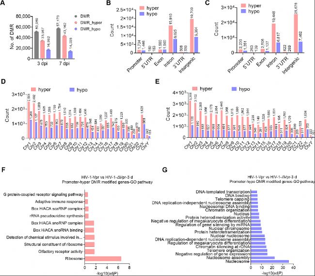 D-E. Vpr誘導的DMRs在感染后第三天(D)和第七天(E)每條染色體上的分布。