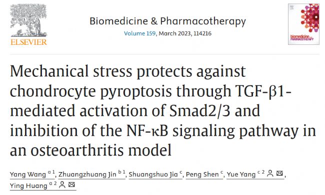 參考文獻:Wang Y, Jin Z, Jia S, Shen P, Yang Y, Huang Y. Mechanical stress protects against chondrocyte pyroptosis through TGF-β1-mediated activation of Smad2/3 and inhibition of the NF-κB signaling pathway in an osteoarthritis model. Biomed Pharmacother. 2023 Mar;159:114216. doi: 10.1016/j.biopha.2023.114216. Epub 2023 Jan 11. PMID: 36634591.