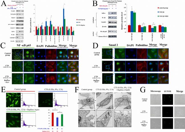 圖2 在 CTS 處理中,升高的 TGF-β1 激活 Smad2/3 并抑制 NF-κB 核易位以抑制軟骨細胞焦亡。(A)CTS 和 10 μM RepSox 處理抑制 TGF-β1 下 NLRP3、TGF-β R I、Smad2、Smad3、pro-caspase-1、caspase-1、IκB-α、IL-1β 和 GSDMD-N 的蛋白質(zhì)印跡分析。(B)4 ng/mL TGF-β1 和 10 μM SIS3 處理以抑制 Smad 通路下細胞質(zhì)中 IκB-α、IL-1β 和 NLRP3 以及細胞核中 NF-κB p65 的蛋白質(zhì)印跡分析。(C、D)NF-κB p65 和 Smad 2 的核易位。(E)軟骨細胞中的 ROS 熒光顯微鏡和流式細胞術(shù)。(F)軟骨細胞的TEM。(G)軟骨細胞的 SYTOX 綠染色。