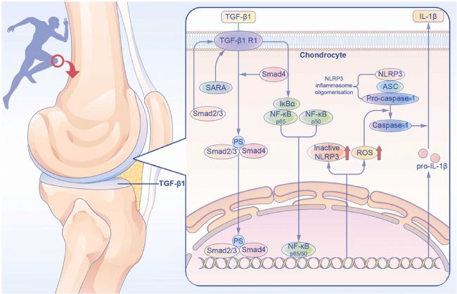 總之,該研究表明, OA 中中等強度的機械負荷保護軟骨細胞免受焦亡。機械刺激強度不當可能會加重體外和體內(nèi)的 OA。此外,TGF-β 1 的升高是機械刺激依賴性的,并對軟骨細胞焦亡產(chǎn)生抑制作用。過量的內(nèi)源性 TGF-β1 可能是不適當?shù)倪\動誘導(dǎo)的 OA 進展的潛在原因。運動誘導(dǎo)的 TGF-β1 協(xié)調(diào)激活 Smad2/3 并抑制 NF-κB 信號通路以抑制 OA 中的焦亡。因此,這項研究為開發(fā)安全有效的 OA 運動療法提供了理論框架。