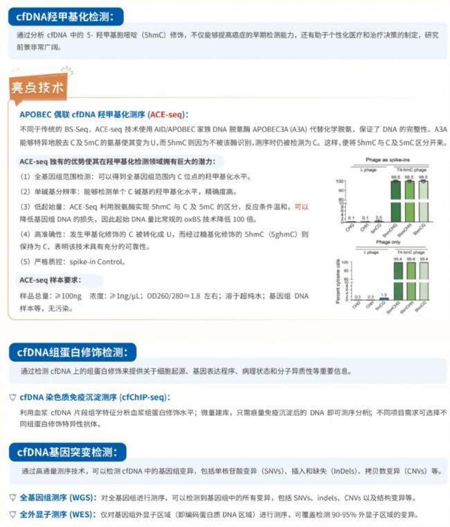此研究建立一種利用DNA脫氨酶(APOBEC3A)實現的非破壞性的、低起始DNA量的鑒定5hmC技術(ACE-seq)。與傳統(tǒng)亞硫酸鹽測序(BS-Seq)不同,ACE-seq不依賴于亞硫酸鹽處理,而是通過酶促脫氨反應來區(qū)分未修飾的胞嘧啶(C)和5-甲基胞嘧啶(5mC),同時保護5hmC不被轉化為尿嘧啶。這種方法允許對cfDNA中的5hmC進行精確的定位和定量分析。