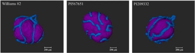 圖5 我們研究的3種不同N2固定的大豆基因型中,每個(gè)結(jié)節(jié)的中心感染區(qū)(CIZ,紫色)和結(jié)節(jié)脈管系統(tǒng)(藍(lán)色)的重建結(jié)節(jié)內(nèi)部組織的三維視圖。