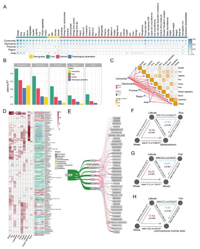本研究采集了來自中國胡煥庸線以東15個省份89個市/縣330個社區(qū)的3224名健康參與者(年齡 18-80 歲,其中 51% 為女性)的糞便和空腹血液樣本,并通過問卷調查或生理檢查收集了地理、人口、食物、營養(yǎng)、生理和血液參數(shù)相關的109個變量信息。通過糞便16S測序分析發(fā)現(xiàn),地理因素和食物攝入是影響腸道微生物組組成的重要變量,并且地理因素與各種食物密切相關。