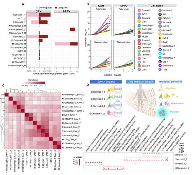 接下來,我們探索了CAM和BPPV中由運(yùn)動驅(qū)動的細(xì)胞類型特異性轉(zhuǎn)錄組變化(圖2A)。在CAM中,胎兒Stromal-1、Stromal-2和Stromal-3表現(xiàn)出最大的運(yùn)動驅(qū)動差異基因表達(dá)變化(圖2A)。母體蛻膜-1細(xì)胞也顯示出相當(dāng)數(shù)量的差異表達(dá)基因(DEGs);然而,與胎兒間質(zhì)細(xì)胞相比,這種變化是溫和的(圖2A)。在BPPV細(xì)胞類型中,DEGs數(shù)量最多的主要是母體單核細(xì)胞類型,其次是胎兒巨噬細(xì)胞-2,可能分別對應(yīng)浸潤性炎癥單核細(xì)胞和Hofbauer細(xì)胞(圖2A)。分位數(shù)-分位數(shù)圖顯示了CAM和BPPV中受胎兒和母體影響最大的細(xì)胞類型(圖2B),這與表現(xiàn)出最大差異基因表達(dá)的細(xì)胞類型基本一致。值得注意的是,在CAM中發(fā)現(xiàn)胎兒間質(zhì)細(xì)胞類型受到分娩的影響,母體蛻細(xì)胞也是如此(圖2B)。同樣,母體單核細(xì)胞和胎兒巨噬細(xì)胞-2在BPPV中受分娩影響最大(圖2B)。分娩對細(xì)胞類型間基因表達(dá)影響的相關(guān)性分析表明,母體骨髓細(xì)胞、蛻膜細(xì)胞和胎兒間質(zhì)細(xì)胞等存在相似之處(圖2C)。胎兒基質(zhì)亞群中,基質(zhì)-1表達(dá)凋亡信號,基質(zhì)-2表達(dá)ATP代謝,基質(zhì)-3表達(dá)炎癥反應(yīng),包括細(xì)胞因子的產(chǎn)生(圖2D),表明這些胎兒基質(zhì)亞群在分娩過程中具有不同的功能。此外,母體decidual -1顯示了與細(xì)胞運(yùn)動和遷移相關(guān)的過程的富集(圖2D),這表明decidual細(xì)胞參與了分娩過程中的白細(xì)胞浸潤。