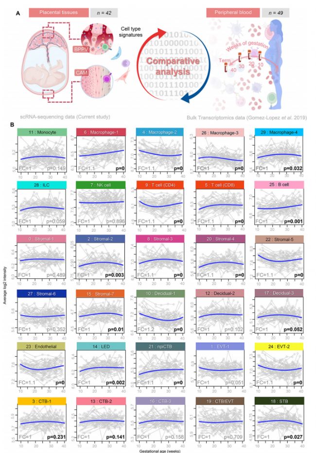 接下來,我們評估了細(xì)胞類型特異性轉(zhuǎn)錄組活性是否可以在整個妊娠期間跟蹤母體循環(huán)。我們首先利用先前生成的孕婦外周血(白細(xì)胞)的大量轉(zhuǎn)錄組數(shù)據(jù)集(n = 49)收集整個妊娠期,并評估細(xì)胞類型特異性轉(zhuǎn)錄物的軌跡(圖5A)。多種細(xì)胞類型特征隨胎齡變化而變化;即巨噬細(xì)胞-1、巨噬細(xì)胞-2、巨噬細(xì)胞-3、巨噬細(xì)胞-4、CD4 T細(xì)胞、CD8 T細(xì)胞、B細(xì)胞、基質(zhì)-2、基質(zhì)-3、基質(zhì)-4、基質(zhì)-5、基質(zhì)-7、蛻膜-1、內(nèi)皮細(xì)胞、LED、npiCTB、EVT-2和STB(圖5B)。觀察到的變化模式在特定細(xì)胞類型的單個集群之間不一致;例如,巨噬細(xì)胞-1隨著胎齡穩(wěn)步增加,巨噬細(xì)胞-2和巨噬細(xì)胞-3則隨著胎齡穩(wěn)步增加。巨噬細(xì)胞-4呈拋物線軌跡(圖5B),提示每種細(xì)胞類型簇的不同作用。考慮到細(xì)胞類型特征可以在母體外周血中追蹤,我們隨后評估了在同一組患者中進(jìn)行縱向分析的足月分娩婦女(n = 21)和足月分娩婦女(n = 28)足月收集的樣本之間的差異(圖6A)。為了比較這些數(shù)據(jù)集,使用CAM 衍生的DEG來創(chuàng)建一個偽體數(shù)據(jù)集,該數(shù)據(jù)集可以直接與大量轉(zhuǎn)錄組數(shù)據(jù)集進(jìn)行對比,同時仍然考慮每種細(xì)胞類型的母源或胎兒來源(圖6A)。CAM與母體外周血細(xì)胞類型特異性轉(zhuǎn)錄本的相關(guān)性表明,胎兒基質(zhì)-2以及母體巨噬細(xì)胞-1、巨噬細(xì)胞-2、蛻膜細(xì)胞-1和單核細(xì)胞呈正相關(guān)(圖6B)。相比之下,幾種細(xì)胞類型特征顯示CAM與母體外周血呈負(fù)相關(guān):胎兒EVT-2、母體CD8 T細(xì)胞和母體內(nèi)皮細(xì)胞(圖6B)。當(dāng)使用來自BPPV的細(xì)胞類型特征時,我們注意到該組織與母體外周血之間的額外相關(guān)性(圖6C)。胎兒EVT-1、CTB-1、巨噬細(xì)胞-2、CD4 T細(xì)胞、CTB-3、STB和npiCTB在室間都顯示出正相關(guān),母體巨噬細(xì)胞-1、巨噬細(xì)胞-2、單核細(xì)胞和蛻膜細(xì)胞-2也是如此(圖6C)。胎兒基質(zhì)-1以及胎兒和母體NK細(xì)胞的特征在BPPV和母體外周血之間呈負(fù)相關(guān)(圖6C)。這一比較分析支持了胎盤細(xì)胞進(jìn)入母體循環(huán)和/或分娩相關(guān)信號驅(qū)動外周白細(xì)胞轉(zhuǎn)錄組變化的概念,這些外周白細(xì)胞的轉(zhuǎn)錄組變化至少部分與胎盤組織中的轉(zhuǎn)錄組變化相同。我們的數(shù)據(jù)進(jìn)一步表明,可以無創(chuàng)地跟蹤母胎信號,以監(jiān)測正常妊娠和分娩,并可能用于生成產(chǎn)科疾病的生物標(biāo)志物。