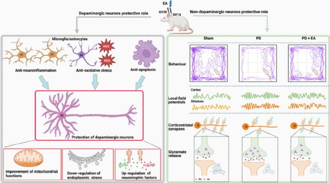 綜上所述,EA 刺激通過多種方法對多巴胺能神經(jīng)元提供神經(jīng)保護作用,這些作用包括抗神經(jīng)炎癥、抗氧化應激和抗凋亡反應,以及調(diào)節(jié)腸道微生物組。此外,先前的研究表明,EA 可以調(diào)節(jié)神經(jīng)膠質(zhì)功能以發(fā)揮抗炎和抗氧化作用。目前的研究強調(diào)了 EA 干預對帕金森病具有顯著的非多巴胺能保護作用。探索 EA 介導的皮質(zhì)紋狀體谷氨酸傳遞變化(非神經(jīng)保護作用)與其對神經(jīng)膠質(zhì)細胞功能的影響(神經(jīng)保護作用)之間的相互作用,可以為 EA 如何緩解 PD 的復雜病理學提供關鍵見解。
