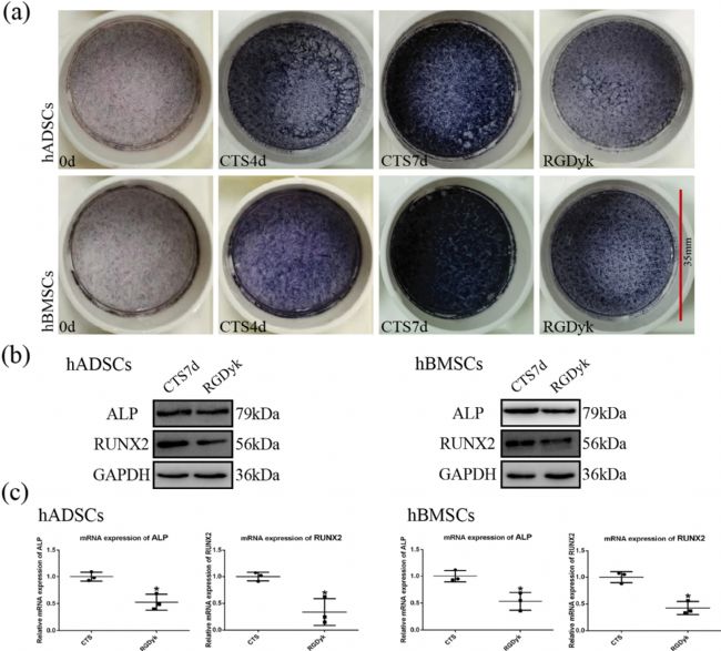 首先,研究調(diào)查了 MSCs 中循環(huán)牽張應(yīng)力(10%形變,0.5 Hz頻率,2 h/d,7d)與早期成骨分化之間的關(guān)系,與對照組相比,CTS負(fù)荷 7 天后 MSCs 中成骨標(biāo)志物 ALP 和 RUNX2 的蛋白質(zhì)和 mRNA 表達(dá)增加,這表明,循環(huán)牽張應(yīng)力可促進(jìn) MSCs 的早期成骨分化。