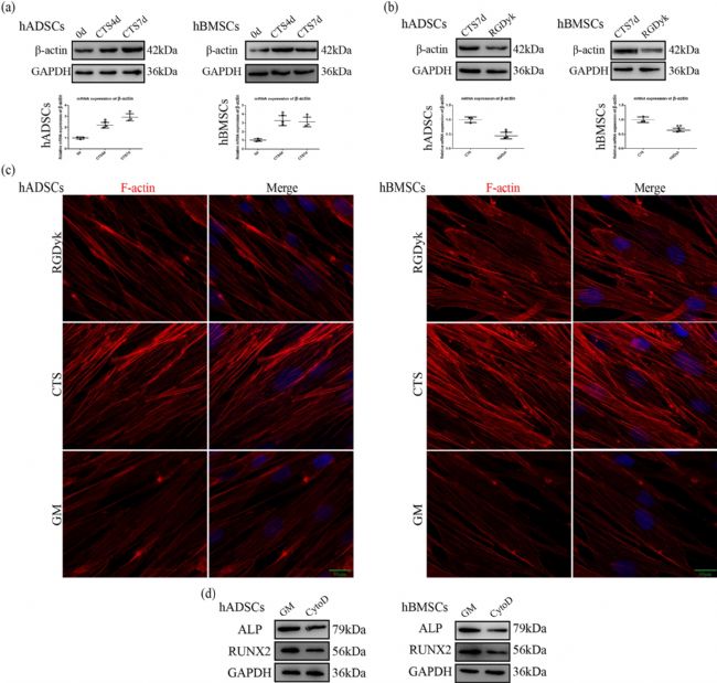 圖2 肌動蛋白絲通過 MSC 中的整合素αVβ 的激活調(diào)節(jié) CTS 誘導(dǎo)的早期階段成骨分化。(a)第4 天和 7 天CTS 下 β-肌動蛋白的蛋白質(zhì)和 mRNA 表達(dá)。(b)CTS 和 RGDyk 組 CTS 下 β-肌動蛋白的蛋白和 mRNA 表達(dá)。(c)GM組、CTS組和RGDyk組在CTS作用下F-肌動蛋白的免疫熒光觀察7天。