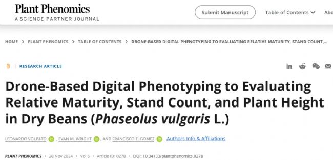 2024年11月,Plant Phenomics在線發(fā)表了美國Michigan State University題為Drone-Based Digital Phenotyping to Evaluating Relative Maturity, Stand Count, and Plant Height in Dry Beans (Phaseolus vulgaris L.) 的研究論文。