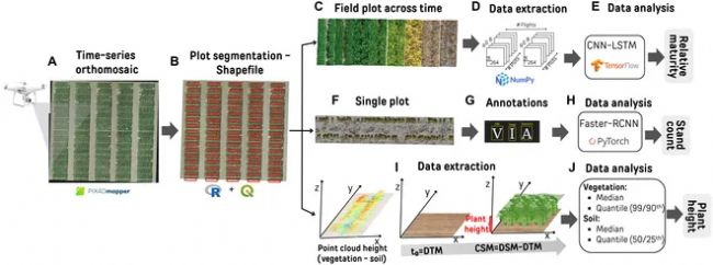 然后,研究針對兩種干豆品種進(jìn)行了相對成熟度(RM)、植株數(shù)量(SC)和植株高度(PH)的數(shù)據(jù)收集工作。研究使用DJI Phantom 4 Pro v2無人機(jī)在植物生長的不同階段執(zhí)行飛行任務(wù),以收集用于SC分析和RM評估的圖像數(shù)據(jù)。為了最小化陰影對圖像的影響,飛行任務(wù)被安排在太陽正午前后的1小時內(nèi)進(jìn)行。此外,研究人員在田間布置了永久性地面控制點(diǎn)(GCPs),以確保圖像具有精確的地理參照。通過Pix4D Mapper軟件處理這些圖像,生成了正射影像圖和數(shù)字表面模型(DSM),隨后利用QGIS軟件和R軟件創(chuàng)建了地塊邊界的矢量圖形。這些數(shù)據(jù)被用來裁剪出每個地塊的圖像,并與相應(yīng)的地面真實(shí)數(shù)據(jù)結(jié)合,用于模型的訓(xùn)練和驗(yàn)證過程(圖2)。