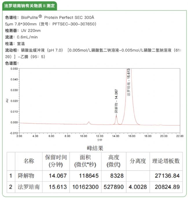 下文依據(jù)《中國(guó)藥典》2020版,使用微純生物科技的MicroPulite® XP tC18和BioPulite® Protein Perfect SEC色譜柱,對(duì)法羅培南鈉有關(guān)物質(zhì)I和Ⅱ進(jìn)行測(cè)定。