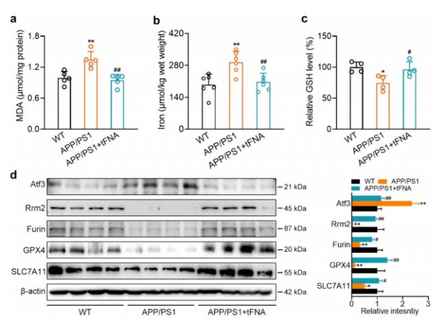 tFNAs在APP/ PS1小鼠體內的實驗結果與體外一致,tFNAs處理降低了7個月大的APP/PS1小鼠的MDA水平和鐵積累,而增加了GSH水平(圖2a-c)。在APP/PS1小鼠中,GPX4和SLC7A11的蛋白水平顯著降低,但tFNAs恢復了他們應有的蛋白水平(圖2d)。同時鐵死亡驅動因子Atf3的蛋白水平上調,而鐵死亡抑制因子Rrm2和Furin的蛋白水平下調,經tFNAs處理后,這些表達被顯著逆轉(圖2d)。上述結果表明,tFNAs可以改善APP/PS1小鼠的鐵死亡。