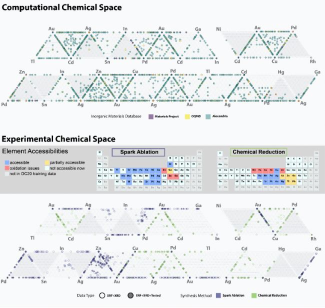 (上)考慮到用于計算數(shù)據(jù)的成分多樣性和綜合性,映射和顯示集合了MP、OQMD和 Alexandria的數(shù)據(jù)庫源。(下)通過兩種合成方法(化學法和 VSP 火花燒蝕)描述元素的可行性,以及所有實驗合成、表征和測試樣品的Chemical Space。較深陰影的三元相圖是由多個圖連接而成的,該項目未進行探索