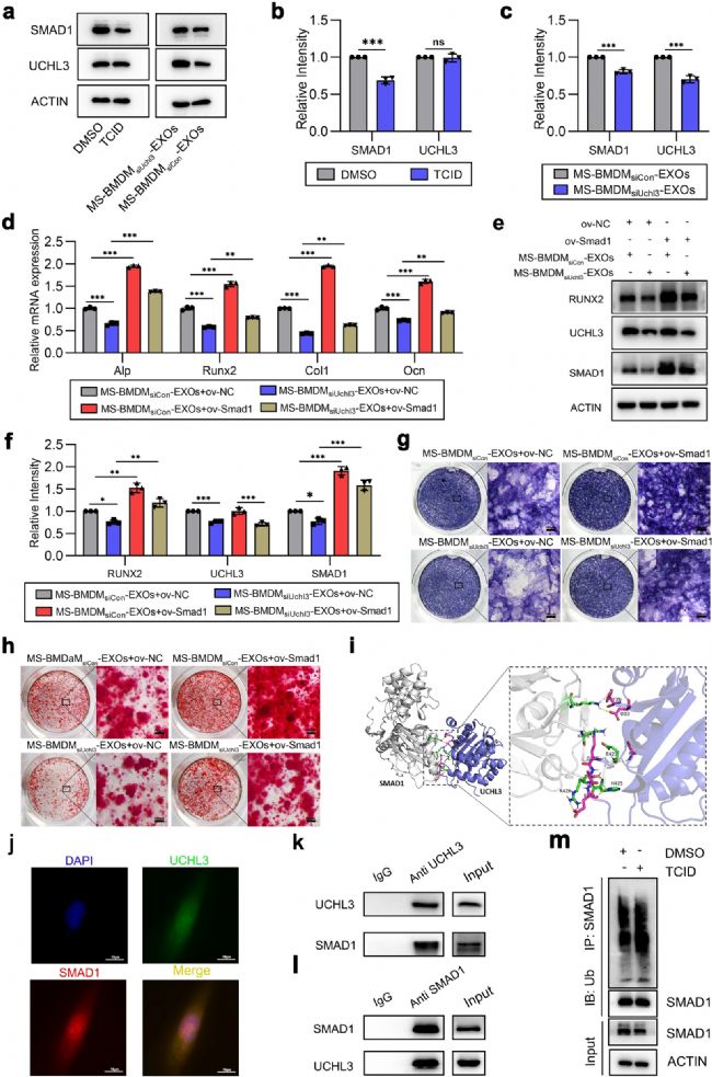 最后,實(shí)驗(yàn)探討了 MS-BMDM 衍生的外泌體 UCHL3 調(diào)節(jié) BMSCs 成骨的機(jī)制。據(jù)報道,UCHL3 可以與 SMAD1 相互作用,SMAD1 是一種參與 BMSC 成骨的經(jīng)典相關(guān)分子。因此,研究人員假設(shè)UCHL3 可以通過調(diào)節(jié) SMAD1 介導(dǎo) BMSC 成骨。為了驗(yàn)證 UCHL3 和 SMAD1 之間的相關(guān)性,使用 TCID 和 MS-BMDMsiUchl3-EXOs 處理 BMSCs,發(fā)現(xiàn)當(dāng) UCHL3 被敲低時,SMAD1 的蛋白水平下調(diào)(圖3 a-c)。然后,在BMSCs中過表達(dá) SMAD1,發(fā)現(xiàn)其顯著逆轉(zhuǎn)了 MS-BMDM-EXOs 中 UCHL3 抑制引起的成骨基因表達(dá)、RUNX2 蛋白(圖3 d-f)、ALP 水平和細(xì)胞外基質(zhì)礦化沉積的下調(diào)(圖3 g、h)。