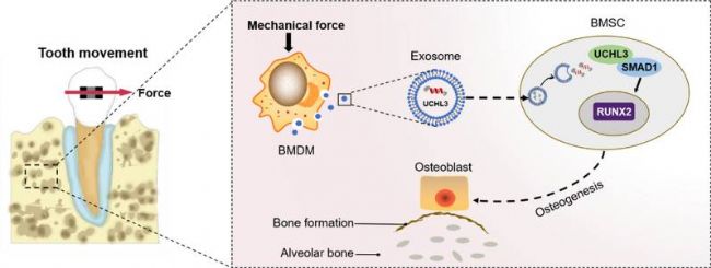 研究表明,機(jī)械力誘導(dǎo)的巨噬細(xì)胞衍生的外泌體 UCHL3 通過靶向 SMAD1 促進(jìn) BMSCs 成骨,從而促進(jìn) OTM 期間牙槽骨的形成。