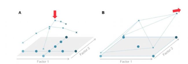 圖 1. 單次單因子法 (OFAT) 和試驗設(shè)計法(DoE) 的比較。 (A) OFAT 方法假設(shè)因子不相互作用并且最優(yōu)條件是正交的,從而得到次優(yōu)工藝條件。 (B) DoE 的統(tǒng)計框架考慮因子和正交性之間的相互作用,并更有效地探索實驗設(shè)計空間,增強對過程的理解并增加找到穩(wěn)健最佳條件的可能性。