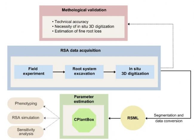 圖1 通過(guò)田間實(shí)驗(yàn)、根系挖掘和原位三維數(shù)字化對(duì)RSA數(shù)據(jù)獲取的過(guò)程進(jìn)行了示意圖表示,然后介紹了在CPlantBox中進(jìn)行參數(shù)估計(jì)的數(shù)據(jù)轉(zhuǎn)換步驟。該流程圖還描述了為測(cè)試技術(shù)準(zhǔn)確性、評(píng)估原位數(shù)字化的必要性和估計(jì)挖掘過(guò)程中潛在的細(xì)根損失而采取的方法學(xué)驗(yàn)證步驟。箭頭表示數(shù)據(jù)和分析的流程,強(qiáng)調(diào)RSA數(shù)據(jù)與表型和模擬輸出的集成。