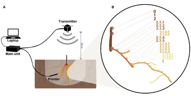 圖2 基坑開挖后原狀土位置根系原位三維數(shù)字化技術(shù)裝置及數(shù)字化協(xié)議。(A)技術(shù)場(chǎng)設(shè)置,主單元連接筆記本電腦,電磁發(fā)射器位于土壤表面上方60cm處,詳細(xì)說(shuō)明用指針記錄根系坐標(biāo)的配置。(B)數(shù)字化過(guò)程的放大視圖,展示了對(duì)數(shù)字化點(diǎn)的唯一ID的系統(tǒng)分配,包括在分支節(jié)點(diǎn)處的雙點(diǎn),以保持根的拓?fù)浣Y(jié)構(gòu)的完整性。