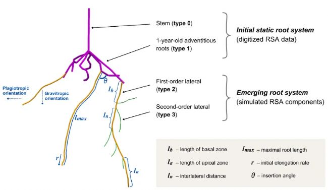 圖3 葡萄RSA模擬方法的示意圖表示。初始靜態(tài)根系來(lái)源于數(shù)字化的RSA數(shù)據(jù),包括莖(類型0)和1年生不定根(類型1)。由模擬的RSA構(gòu)件組成的新生根系包括一級(jí)側(cè)枝(類型2)和二級(jí)側(cè)枝(類型3)。