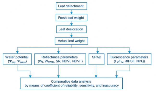 本文提出了一種便捷的比較和分析方法,以幫助為葉片級測量做出選擇。以干燥后的煙草和大麥葉片模型為案例,我們測量了光譜反射率(R)和葉綠素?zé)晒獾膮?shù),然后通過引入的系數(shù)(可靠性系數(shù)、靈敏度和不準確性)評估并比較了它們的適用性。結(jié)果表明,葉綠素?zé)晒獗裙庾V反射率(R)更可靠、更通用地反映葉片水分變化情況。此外,最合適的做法是同時使用這兩種方法,因為根據(jù)可靠性系數(shù)對它們的參數(shù)進行特定排名可能表明葉片干燥變化的特定情景。