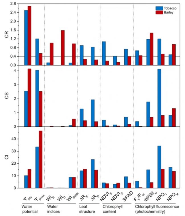 圖2 在相對含水量區(qū)間100%~50%內(nèi),煙草和大麥干燥葉片樣品測定參數(shù)的可靠性系數(shù)(CR)、靈敏度系數(shù)(CS)和不準確系數(shù)(CI)。根據(jù)參數(shù)所反映的葉片特征類型,將這些參數(shù)分為5組。CR圖中的一條水平線表示可靠性閾值(CR = 0.4)
